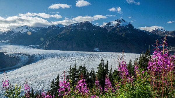 Bald darauf erreiche ich den Kreuzungsort Kitwanga. Von hier geht es nun also auf dem Cassiar Highway 37 in den einsamen Norden BCs und weiter ins Yukon Territory. Nächster nennenswerter Ort an der Strecke ist in 750 km Entfernung Watson Lake. Dazwischen liegen nur 2-3 Indianersiedlungen und Versorgungsstationen. Nach einem Gewitter verschwinden die Wolken dann doch langsam, ja es kommt sogar einwenig Blau zum Vorschein. So macht das doch schon viel mehr Spass, insbesondere wenn man dann auch noch einen Schwarzbären beim Überqueren der Strasse sieht. Der Strassenrand ist gesäumt von einem regelrechten Blumenmeer und dahinter erstrecken sich einsame Bachläufe, Sümpfe und Wälder. Nach dem Meziadin Lake biege ich auf die Stichstrasse nach Steward ein. Dieser Aussenposten der Zivilisation bildet zusammen mit seinem amerikanischen Nachbarsort Hyder die Grenze zwischen Kanada und Alaska. Die Fahrt durchs Küstengebirge ist ein absolutes Highlight. Die Strasse führt entlang des wilden Bear Rivers und beidseits der Strasse sind hohe, nach wie vor Schneebedeckte Berggipfel zu sehen. Dazwischen befinden sich immer wieder majestätische Gletscher. Insbesondere der Bear Glacier ist eine imposante Erscheinung und ein lohnenswertes Fotosujet. Weiter geht’s in Richtung Fjord.
