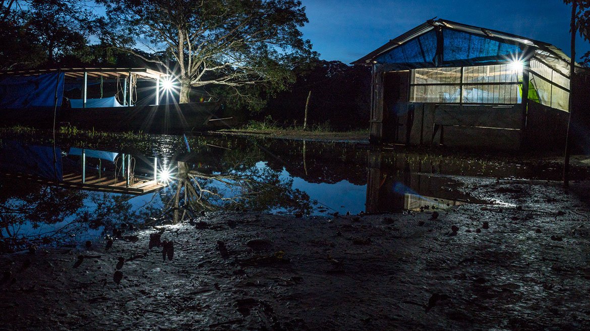 Bald darauf erreichen wir unseren Lagerplatz für die Nacht. Hier am Ufer wohnt ein älterer Herr in seiner einfachen Hütte. Nebenan steht das noch einfachere Hüttchen, welches zu unserer Übernachtung dient. Es besteht lediglich aus behelfsmäßig zusammengebauten Wänden, einem Wellblechdach und einigen Blachen zur Abdichtung. Leicht erhöht über dem schlammigen Boden sind zwei breite, aber unbequeme Betten aus Zeitungspapier errichtet. Diese werden nun mit Bettzeugs versehen und vor allem mit einem Mückennetz abgedichtet.