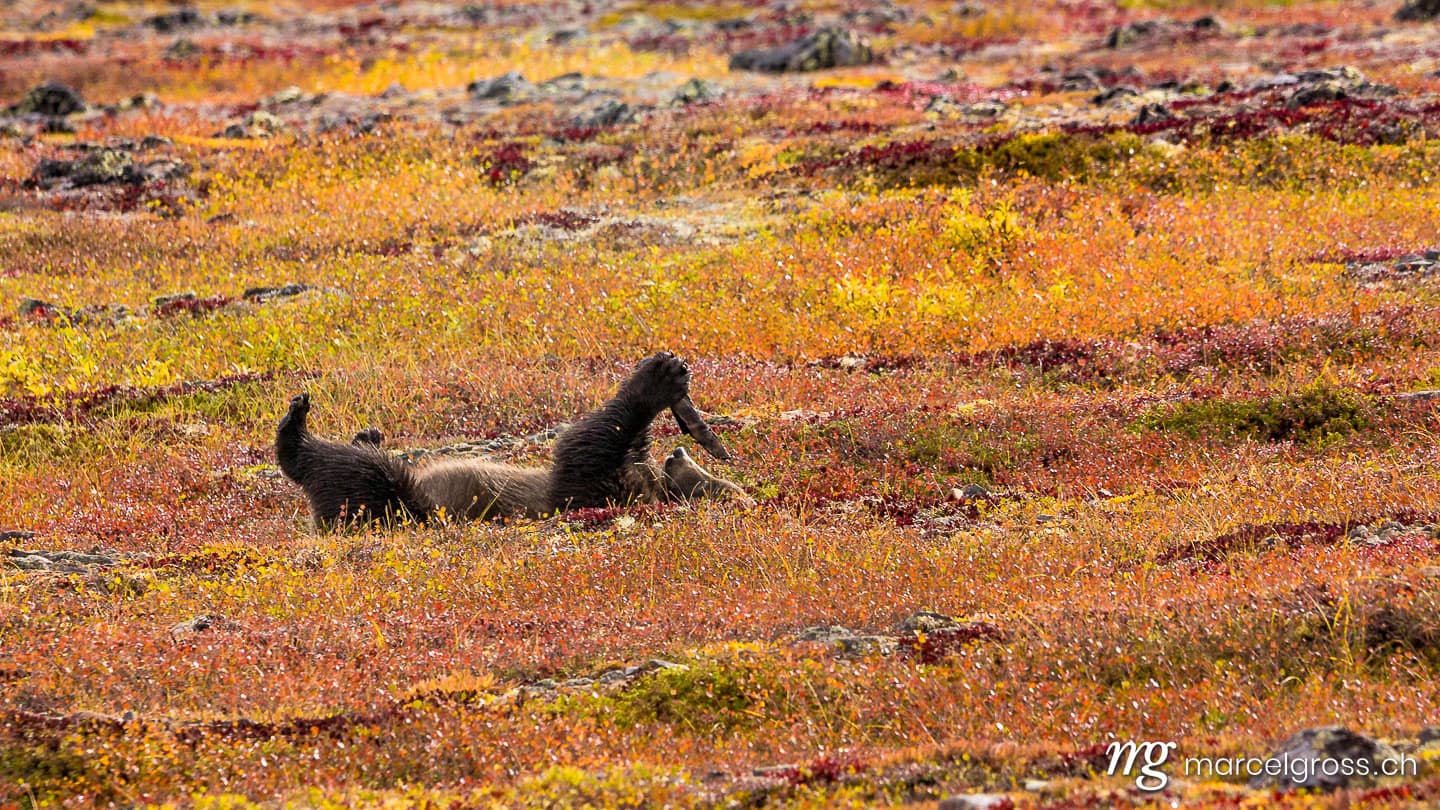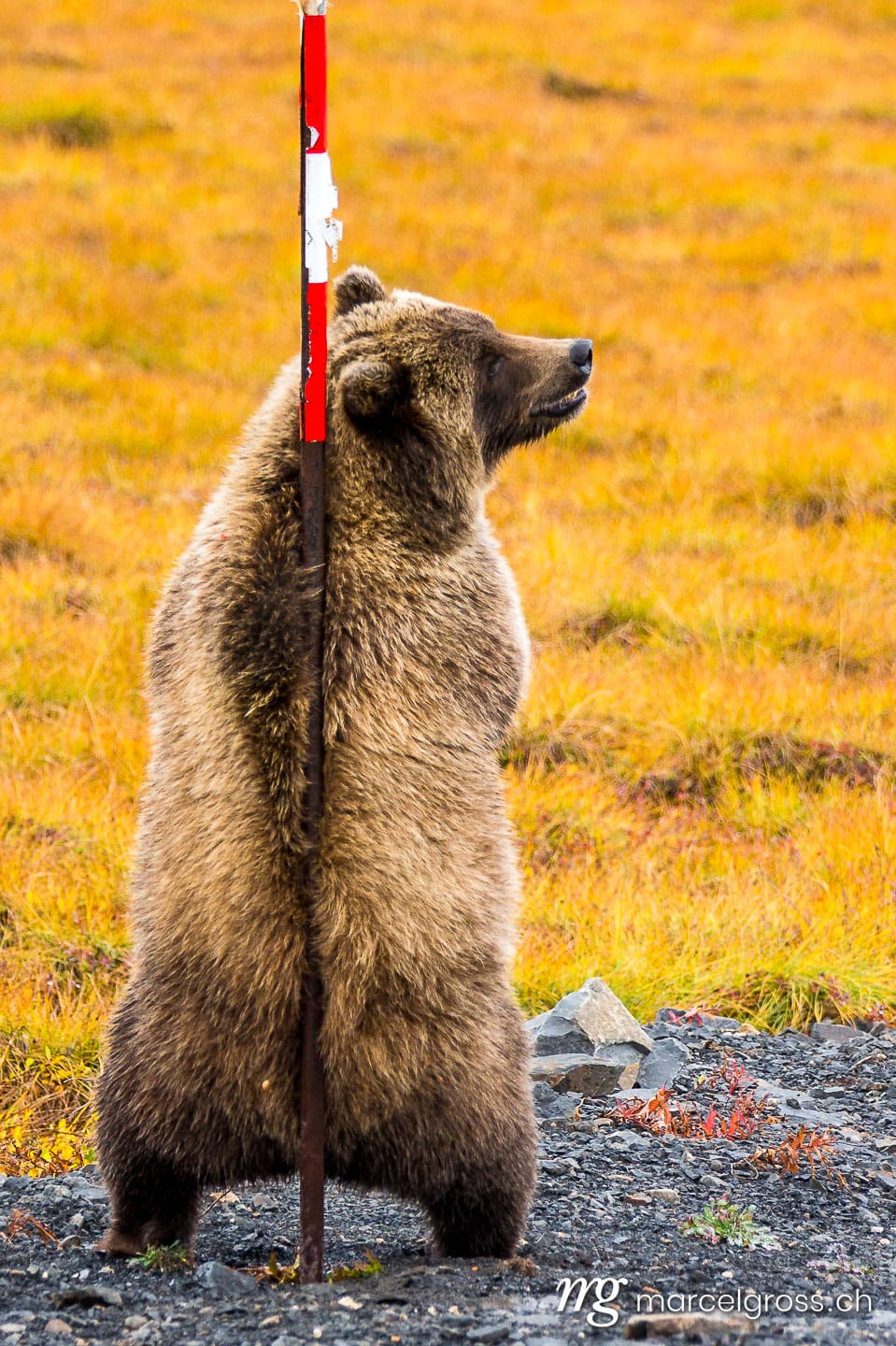 Mein wohl bekanntestes Bild ist mir im entlegenen Norden des kanadischen Yukon Territory gelungen. Zwei Grizzlybären (wohl Mutter und fast erwachsenes Jungtier) kratzen sich an einer Stange am Straßenrand den Rücken. Das ganze eingebettet in die erstaunlichsten Herbstfarben der kanadischen Tundra. Diese Bilder tanzender Bären stiessen auf ein grosses Medienecho. Insbesondere in den britischen Zeitungen (wie Sun, Daily Mail, The Mirror & The Times, The Telegraph), aber auch im renommierten National Geographic Kids, der Online-Zeitung The Dodo und einigen weiteren Zeitungen veröffentlichten die Story.