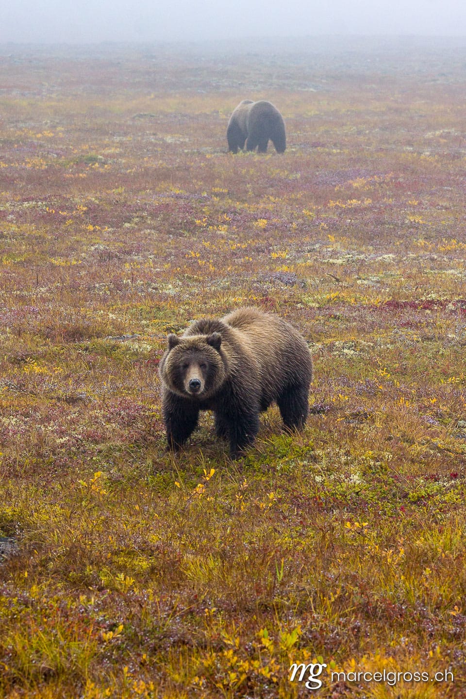 Diese Bilder zeigen einige meiner unvergesslichsten Begegnungen mit Bären, die ich auf meinen Reisen hatte. Der oft etwas tapsig anmutende Meister Petz ist seit jeher ein Sinnbild für Kraft und übt eine ungemeine Faszination auf uns Menschen aus. Besonders prächtig sind die Küstenbraunbären in Alaska, welche durch das üppige Nahrungsangebot wie die Lachse zu wahren Giganten heranwachsen. Im Innern des Kontinents leben die kleineren Grizzlybären. Mit etwas Glück kann man einen solchen entlang des berühmten Icefields Parkway im Banff-Nationalpark, im wilden Yukon, dem Glacier Nationalpark oder den kanadischen Rocky Mountains beobachten. Einige meiner besten Bären Bilder sind mit von zwei kämpfende Grizzlybären-Jungtieren in der Nähe des Lake Clark-Nationalparks gelungen.