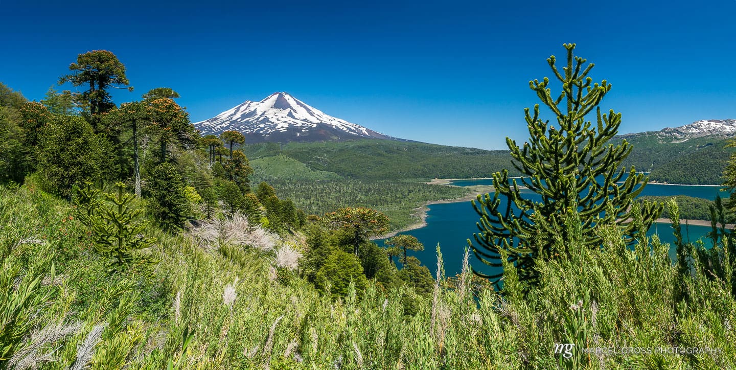 Der Chilenische Lake District ist geprägt vom gemässigten Valdivianischer Regenwald, Vulkanen, Wasserfällen, zahlreichen Nationalparks und natürlich den namensgebenden Seen. So beispielsweise der wunderbare, zweistufige Salto El Léon im Parque Nacional Villarrica mit dem gleichnamigen Bilderbuch-Vulkan Villarrica bei Pucón oder dem Vulkan Llaima im Parque Nacional Conguillio. Hier wachsen auch die hohen Alercen und die urtümlich anmutenden Chilenische Araukarien, welche in ähnlicher Form bereits zur Zeit der Dinosaurier wuchsen.