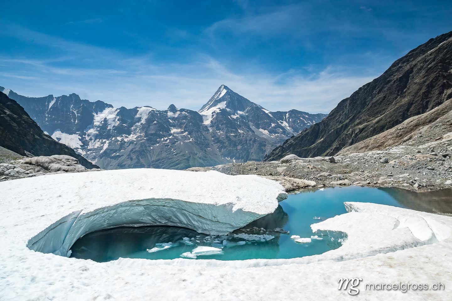 Auch das Gebiet um den majestätischen Aletschgletscher, dem grössten Alpengletscher, bietet fantastische Aussichten und unvergessliche Erlebnisse. Doch das Wallis bietet eine Vielzahl weitere schmelzende Eisriesen wie den Rhonegletscher, Gornergletscher oder den Zinalgletscher. Umgeben von den majestätischen Walliser Alpen findet jeder Fotograf die wunderbarsten Fotosujets für seine Wallis Bilder.